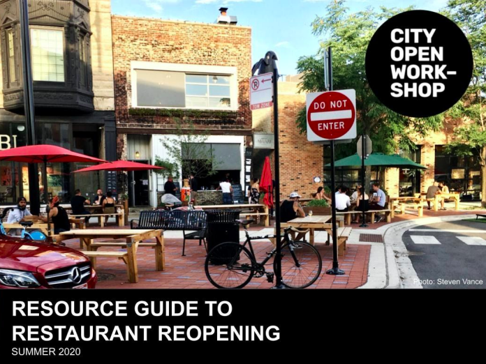 City Open Workshop consultants have created a restaurant resource guide for reopening for restaurants and chambers of commerce to answer common questions regarding setting up a tent, sidewalk cafe permitting, parklets, and more. Each firm worked on creating images that can be seen in the guide.