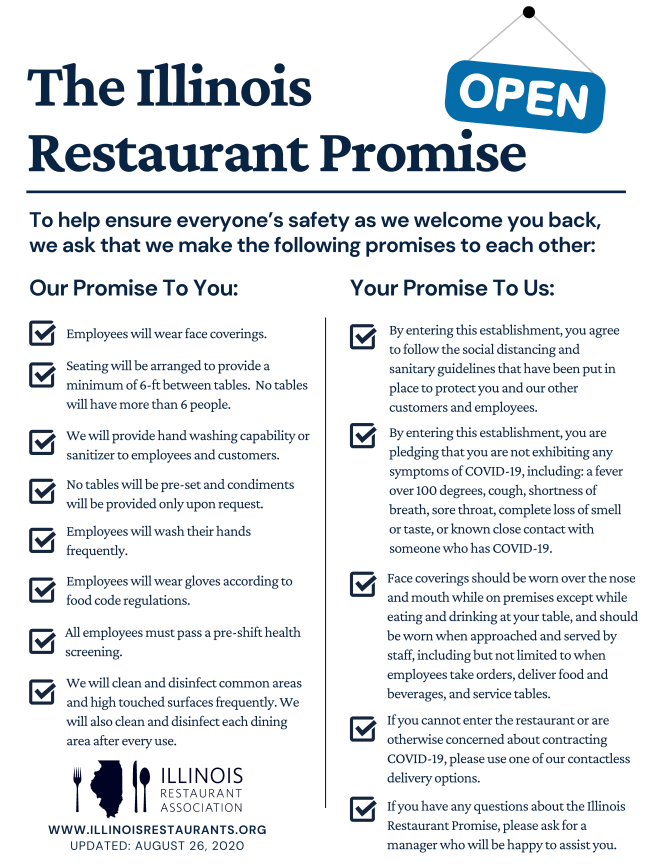New state guidelines are now in effect that require patrons to wear face coverings both in indoor and outdoor dining settings in all eleven regions in the state. These latest guidelines require patrons to wear a mask during any interaction with wait staff, food service workers and other employees at bars and restaurants, including but not limited to when employees take patrons orders, deliver food and beverages, and service tables. Click here to read the updated guidelines for restaurants and bars. Updated Illinois Restaurant Promise - Post at Your Establishments
