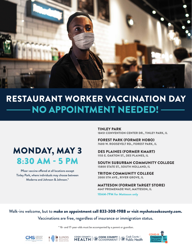 Yesterday, IRA President & CEO Sam Toia joined Cook County Board President Toni Preckwinkle and county health officials to announce upcoming Restaurant Worker Vaccination Days with Cook County starting Monday, May 3 at various locations in suburban Cook County. The events will be ongoing every Monday throughout May. Vaccinations are free, regardless of insurance or immigration status. Click here to make an appointment, or visit one of the county's walk-in vaccination sites. Click here to read more about the initiative from Chicago Sun-Times.