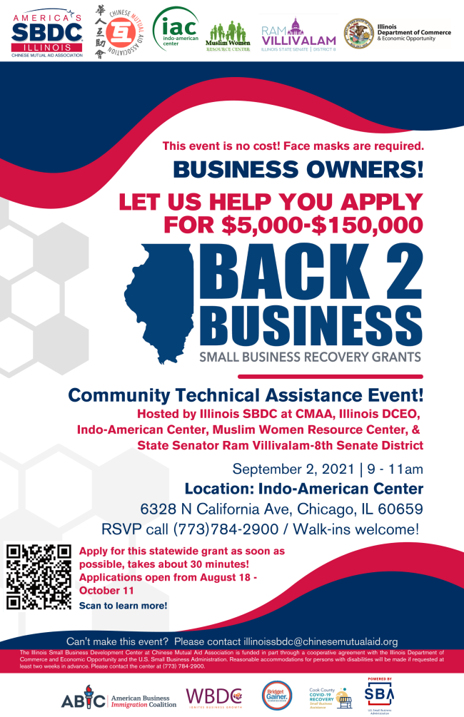 Business owners seeking to apply for a Back to Business grant are invited to attend a Community Technical Assistance event Thursday, September 2 from 9:00 to 11:00 a.m. at Indo-American Center, located at 6328 N. California in Chicago. Download the event flyer with more information in English, Mandarin, and Hindi.