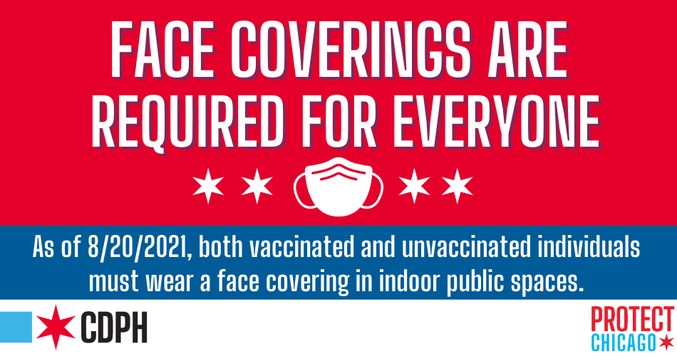 As a reminder, masks are now required in indoor public settings for all persons over 2 years old - regardless of vaccination status - in Chicago, Cook County, and throughout the state of Illinois.