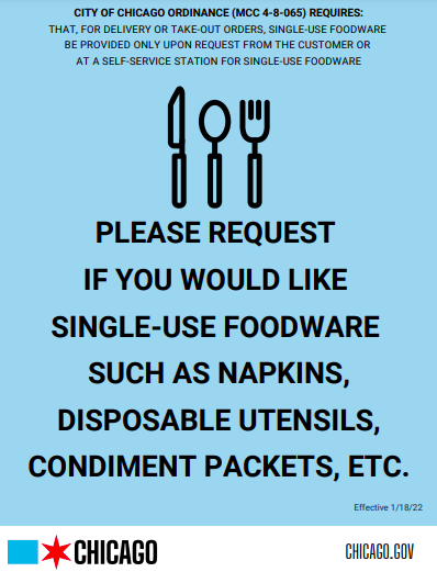 On Tuesday, January 18, the city of Chicago’s ordinance that regulates the offering of single-use foodware at takeout or delivery from restaurants will go into effect. The ordinance requires restaurants to provide single-use foodware - such as napkins, disposable utensils, or condiment packets - for delivery or takeout only upon request from the customer or at a self-service station.