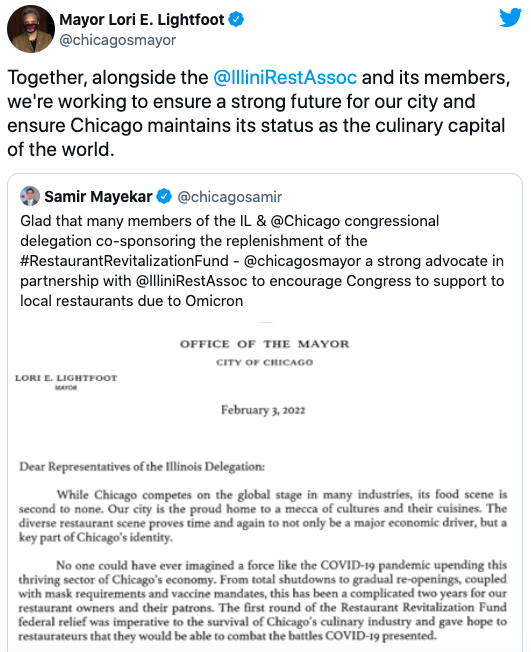 Thank you for Mayor Lightfoot for standing with the IRA to call on Illinois' Congressional delegation to replenish the Restaurant Revitalization Fund (RRF). Click here to read the letter. If you have not already done so, please take one minute to