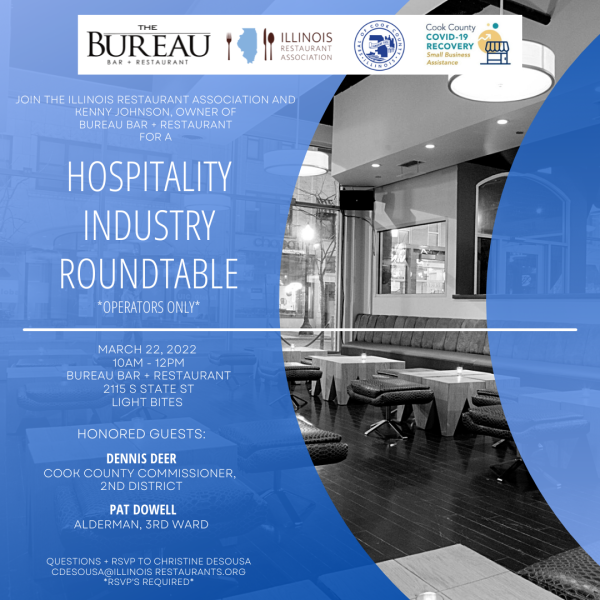 Join the IRA for an upcoming Hospitality Industry Roundtable on Tuesday, March 22 from 10:00 a.m. to 12:00 p.m. at Bureau Bar & Restaurant in the South Loop. This event open to restaurant and hospitality operators only.