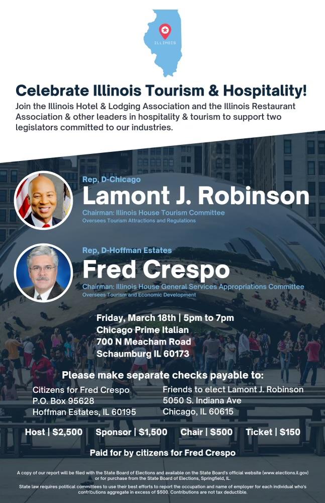 You are invited to join the IRA and Illinois Hotel & Lodging Association for an event this Friday, March 18 from 5:00 to 7:00 p.m. in support of Representative Lamont Robinson and Representative Fred Crespo at Chicago Prime Italian in Schaumburg.