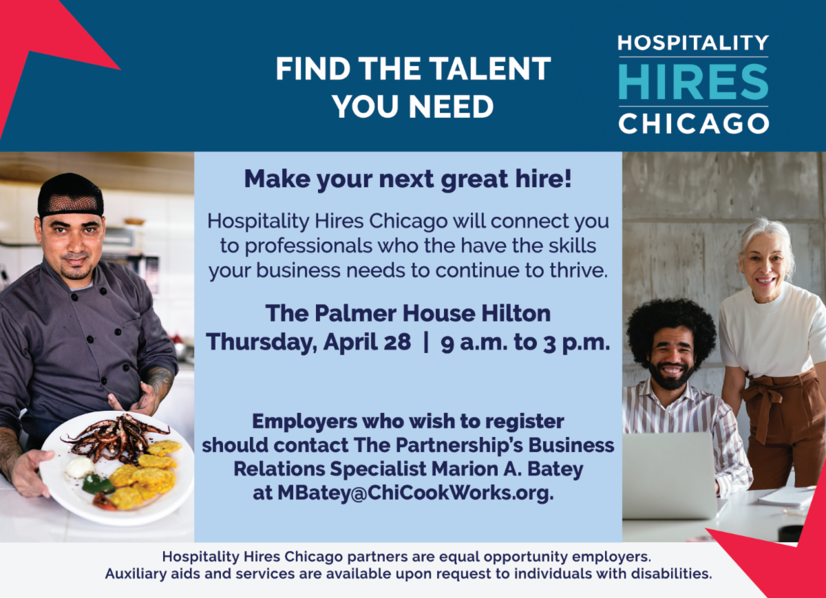 Cook Workforce Partnership (The Partnership) to host the 5th Hospitality Hires Chicago (HHC) event on Thursday, April 28 from 9:00 a.m. to 3:00 p.m. at The Palmer House Hilton Chicago.