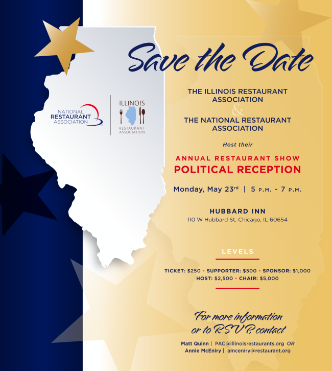 To bolster our efforts to support candidates and issues that are favorable to the hospitality industry, the IRA and National Restaurant Association are hosting our Annual Restaurant Show Political Reception on Monday, May 23 from 5:00 to 7:00 p.m. at
