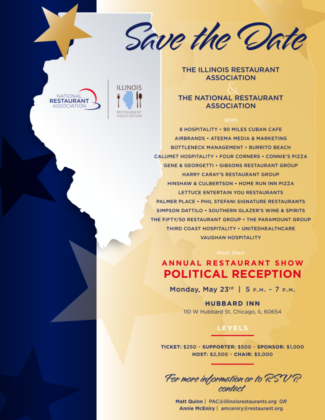 To bolster our efforts to support candidates and issues that are favorable to the hospitality industry, the IRA and National Restaurant Association are hosting our Annual Restaurant Show Political Reception on Monday, May 23 from 5:00 to 7:00 p.m. at
